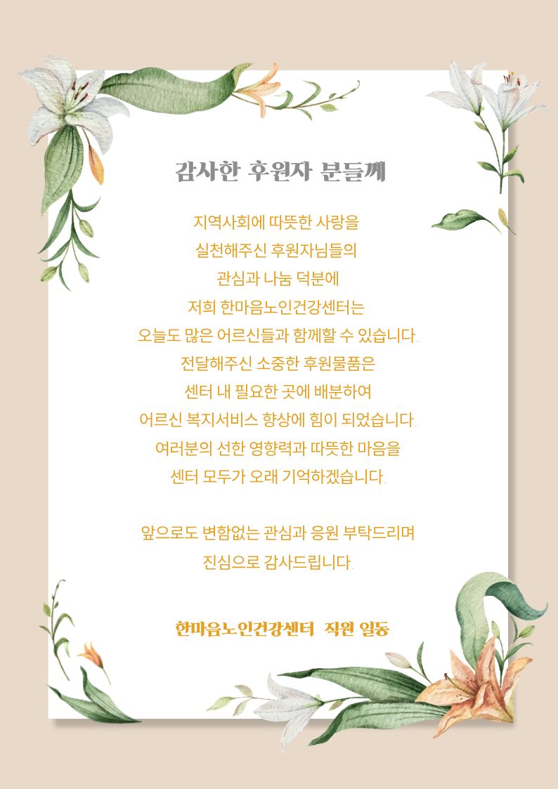 Áö¿ª»çȸ¿¡ ¿ÂÁ¤À» ³ª´©¾î ÁֽŠ´öºÐ¿¡ ¿ì¸® ¼¾ÅÍ ¾î¸£½Åµé²² Å« À§·Î¿Í ±â»ÝÀÌ ÀüÇØÁ³½À´Ï´Ù. ¼ÒÁßÇÑ ¸¶À½ÀÌ ´ã±ä ÈÄ¿øÀº ¾î¸£½ÅµéÀÇ °Ç°ÇÏ°í µû¶æÇÑ ÀÏ»ó¿¡ ÀÇ¹Ì ÀÖ°Ô »ç¿ëÇϰڽÀ´Ï´Ù. Áø½ÉÀ¸·Î °¨»çµå¸®¸ç, Ç×»ó °Ç°°ú ÇູÀÌ ÇÔ²²ÇÏ½Ã±æ ¹Ù¶ø´Ï´Ù. ♥
